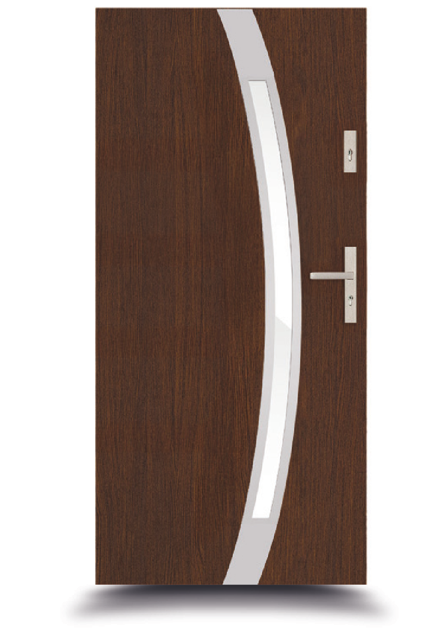 Drzwi zewnętrzne w kolorze ciemny orzech to eleganckie połączenie klasyki z nowoczesnym detalem. Ich powierzchnia odwzorowuje naturalne usłojenie drewna w głębokim, brązowym odcieniu, nadając skrzydłu szlachetny i ponadczasowy charakter. Centralnie umieszczony, pionowy panel ze szkła mlecznego o zakrzywionej linii dodaje lekkości i subtelnej asymetrii.