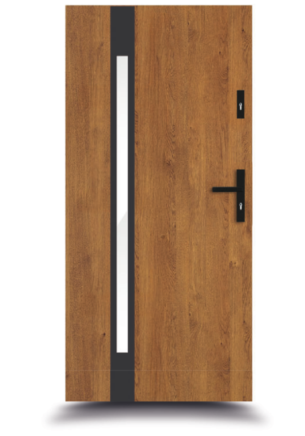 Po lewej stronie skrzydła umieszczono pionowy panel szklany w ramce INOX w kolorze głębokiej czerni, która pięknie kontrastuje z drewnopodobnym dekorem. Czarna klamka i zamek tworzą z nią spójną, minimalistyczną kompozycję, idealną do nowoczesnych domów jednorodzinnych, willi i rezydencji.