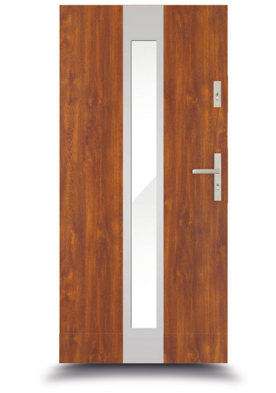 Te stalowe drzwi zewnętrzne FortisLine Thermo 72 G01-3 w kolorze złoty dąb to doskonałe połączenie nowoczesnej technologii z ciepłem klasycznego drewna. Ciepły, miodowy odcień dębu o pionowym usłojeniu nadaje im elegancki, przytulny charakter, idealny do domów jednorodzinnych, rezydencji i willi.