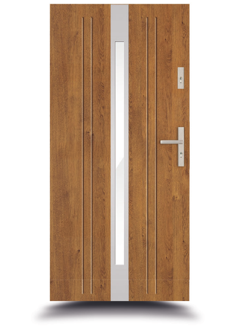 Centralnie umieszczony, pionowy panel ze szkła mlecznego wprowadza wizualną lekkość i subtelne doświetlenie wnętrza. Przeszklenie osadzone jest w ramce w kolorze INOX, która kontrastuje z drewnopodobnym wykończeniem, podkreślając nowoczesny styl drzwi. Po bokach panelu znajdują się pionowe frezy, które dodają rytmu i symetrii. Klamka w kolorze INOX ma prostą, poziomą formę i jest osadzona na prostokątnej rozecie, tworząc spójną kompozycję z ramką przeszklenia.
